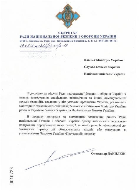 При этом Данилюк поручил упомянутым государственным органам обеспечить соблюдение ограничений до завершения срока их действия или отмены. «Секретарь СНБО Украины Александр Данилюк в порядке контроля за выполнением решений СНБО обратил внимание указанных государственных органов на необходимость обеспечения неукоснительного соблюдения санкций и мониторинга их эффективности до истечения срока их действия или отмены в установленном законом порядке», - говорится в документе.