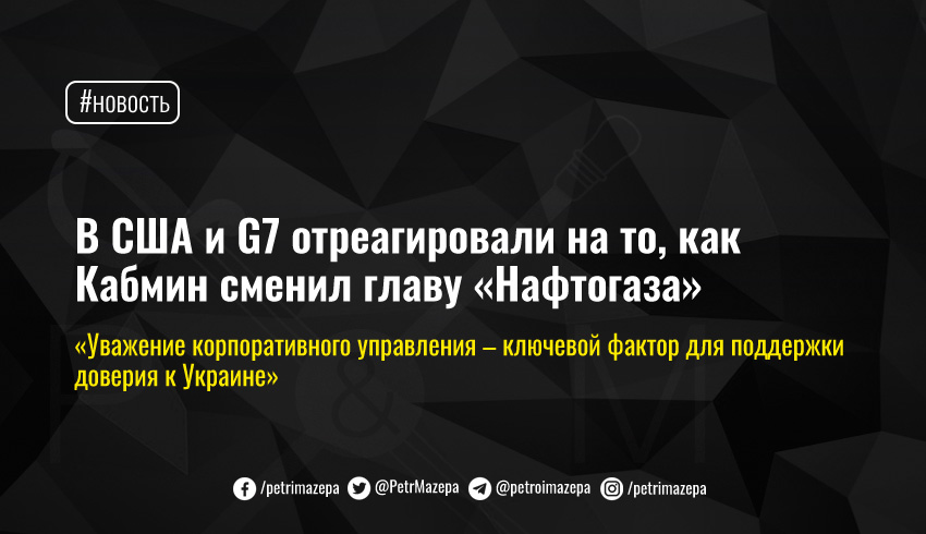 Также на события в Украине отреагировали послы G7. «Эффективное управление госпредприятиями, свободное от политического вмешательства, имеет решающее значение для конкурентоспособности, процветания и выполнения международных обязательств», – сказано в заявлении организации.