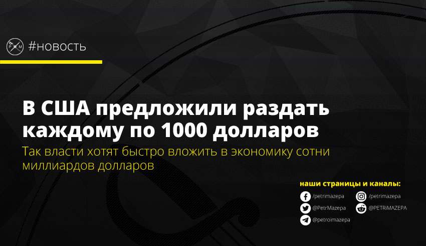 Президент США Дональд Трамп и министр финансов Стивен Мнучин предложили выдать каждому взрослому гражданину США чек на 1000 долларов. Таким образом власти хотят обеспечить быстрое вливание в экономику сотен миллиардов долларов в условиях падения, вызванного коронавирусом.