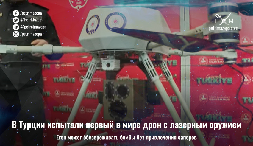 Дрон Eren может уничтожать взрывные устройства-боеприпасы и самодельные бомбы в полевых условиях с помощью лазера на расстоянии. Он успешно прошел испытания на дистанциях 500, 300 и 100 метров.