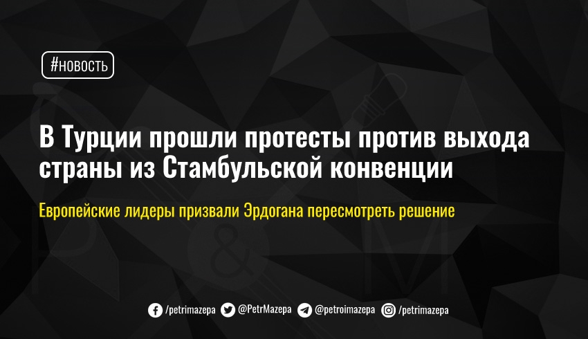 Европейские лидеры раскритиковали решение Турции выйти из Стамбульской конвенции, направленной на защиту женщин от насилия. Представители стран Европы призвали президента страны Тайипа Реджепа Эрдогана пересмотреть решение. Также в Стамбуле протестовали женщины, которые не согласны с решением правительства выйти из конвенции.