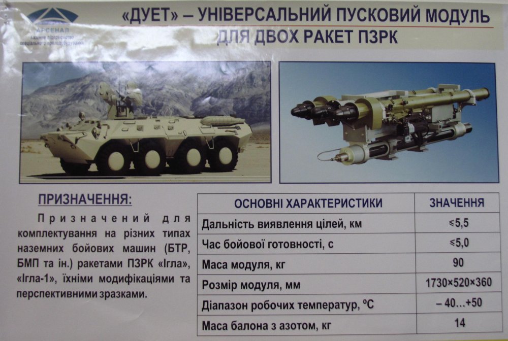 Отечественное оборонное предприятие «Арсенал» совместно с компанией Diamond Defense Systems ведет разработку мобильного зенитно-ракетного комплекса «Дуэт» ближнего радиуса действия (до 5 км).