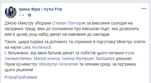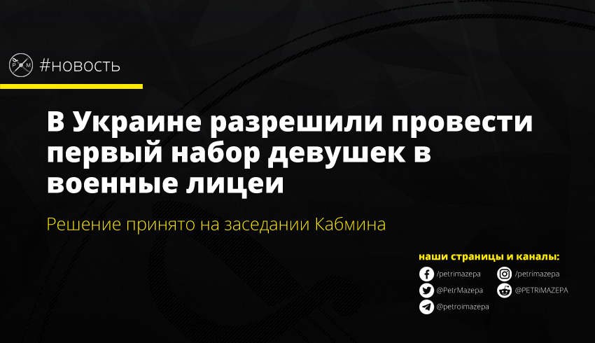 Министр по делам ветеранов Ирина Фриз сообщила, что на рассмотрение правительства министром обороны Степаном Полтораком внесено распоряжение о наборе девушек в военных лицеях. Распоряжение про военные лицеи было поддержано и уже в этом году будет проведен первый набор.