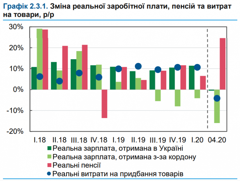 В апреле 2020 года впервые с марта 2016 года реальная зарплата уменьшилась на 0,5% из-за низкой деловой активности и меньшего спросом на рабочую силу. Об этом говорится в июньском отчете Национального банка (НБУ) о финансовой стабильности.