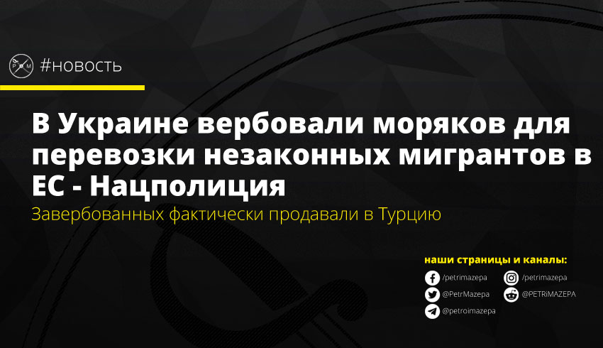 Национальная полиция раскрыла в Украине транснациональную группировку по торговле людьми. Преступники занимались вербовкой украинских моряков, которых потом продавали в Турцию, где тех привлекали к перевозке в страны ЕС незаконных мигрантов. Фактически, все завербованные украинские моряки на данный момент отбывают наказание в Греции или Италии.