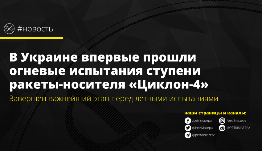 В Украине провели испытания ступени ракеты-носителя среднего класса «Циклон- 4», спроектированной КБ «Южное» и изготовленной на заводе «Южмаш». В частности, состоялся прожиг третьей ступени «Циклона – 4». Проведенные испытания ступени ракеты-носителя среднего класса стали первыми в новейшей истории Украины.