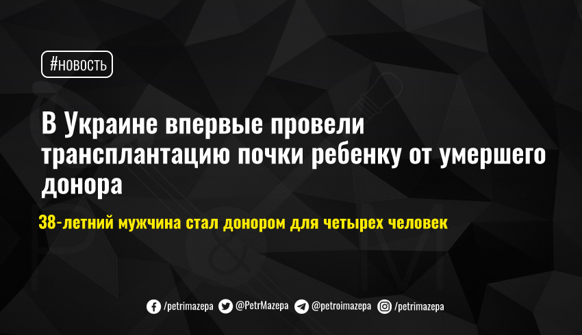 Основательница ОО «Всеукраинская платформа донорства iDonor» Ирина Заславец на своей странице в соцсети рассказала, что донором почки стал 38-летний мужчина, которому после тяжелой черепно-мозговой травмы диагностировали смерть мозга. Пересадили почку девочке, у которой летом начала развиваться острая почечная недостаточность.