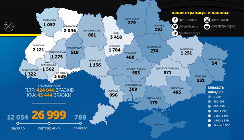 В Украине за последние сутки подтвердили 485 новых случаев COVID-19. При этом 242 человека выздоровели. С начала эпидемии в Украине COVID-19 подтвердили у 26 999 человек, из них 12 054 пациентов выздоровели и 788 - умерли. За минувшие сутки 242 человека выздоровели и 11 умерли. За минувшие сутки провели 9504 тесты методом ПЦР и 2820 ИФА-тестов.