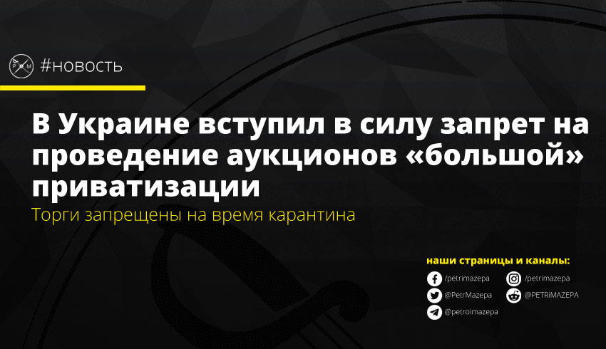 В Украине вступил в силу запрет на проведение аукционов большой приватизации до завершения карантина. Закон №853-IX 24 сентября опубликован в издании «Голос Украины», и вступил в силу со дня, следующего за днем его опубликования.