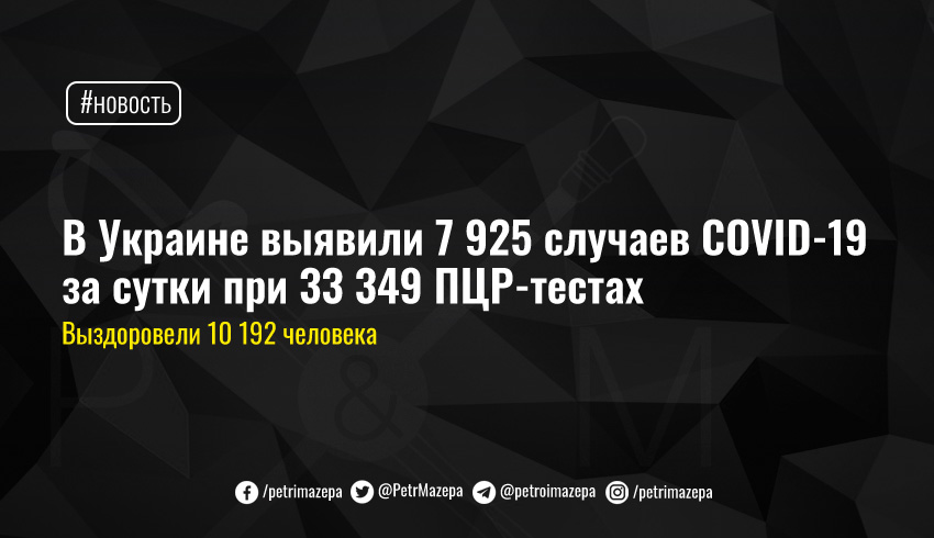 В Украине выявили 7 925 случаев COVID-19 за сутки при 33 349 ПЦР-тестах
