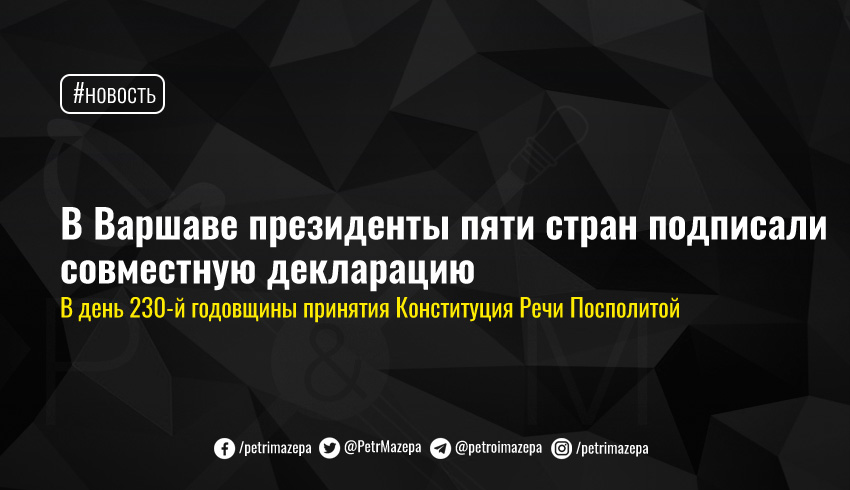 Сегодня, 3 мая, президенты Украины, Польши, Эстонии, Латвии и Литвы подписали в Варшаве совместную декларацию. В ней говорится о том, что солидарность народов в условиях современных угроз безопасности является одним из краеугольных камней мира, стабильности, развития и благосостояния.