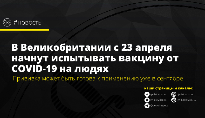В Великобритании с 23 апреля начнут испытывать вакцину от COVID-19 на людях
