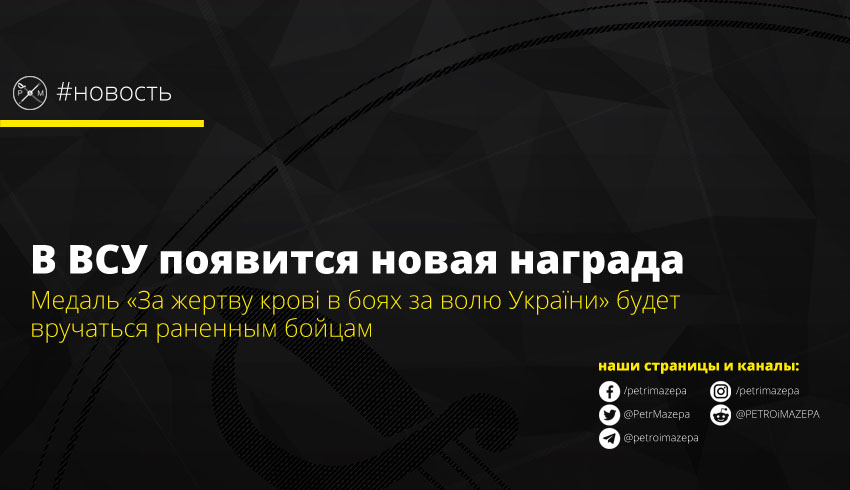 В ВСУ появится новая награда – «За жертву крові в боях за волю України». Первая награда, которая «перерезает ленточку» старта реформирования наград, будет вручаться за ранение, степень которого будет отмечаться веточкой на ленте медали и на планке.
