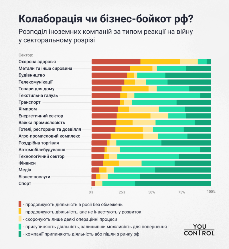 Центр YouControl обнародовал результаты исследования по поводу выхода иностранных компаний из россии — представлены рейтинги стран и секторов экономики, которые лучше и хуже всего отреагировали на войну россии.
