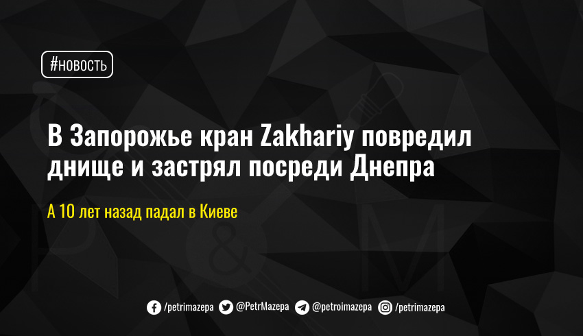 Самый большой в Украине плавкран Lifting LK-800 (Zakhariy), который сейчас работает в Запорожье на строительстве вантового моста,  6 мая застрял посреди Днепра между Центральным пляжем со стороны Хортицы, и недостроенным мостом. Причиной инцидента стало столкновение со скалой.