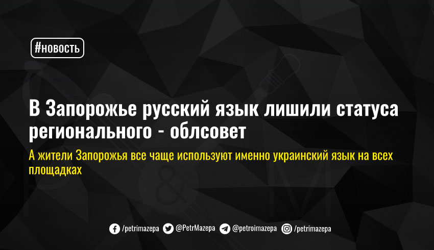 Запорожский облсовет сообщил, что решение еще 2012 года о придании русскому языку регионального статуса на территории области официально отменено. В облсовете подчеркнули, что депутаты и сотрудники используют только государственный язык в работе, и среди жителей Запорожья также наблюдается тенденция к росту популярности украинского языка.