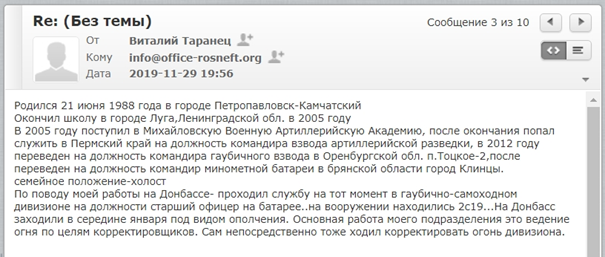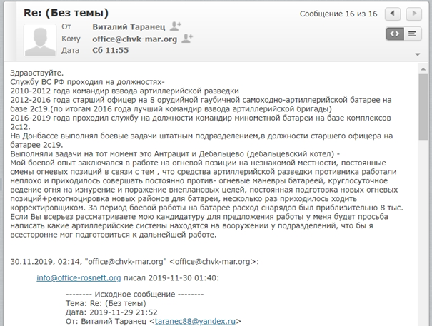 Согласно интервью с бывшими сотрудниками ГУР МОУ, эти комментарии появились из-за того, что фиктивная вербовка привлекла слишком много кандидатов, которые не подходили для ее целей. У некоторых имелся боевой опыт, но они никогда не воевали на Донбассе и потому не представляли интереса тдля украинской военной разведки. Действительно, электронные письма от соискателей на электронную почту [email protected], подконтрольную ГУР МОУ (письмами поделились с командой Bellingcat), показали, что хотя они не принимали участия в операциях на востоке Украины, по крайней мере некоторые из них воевали в Афганистане и Чечне.
