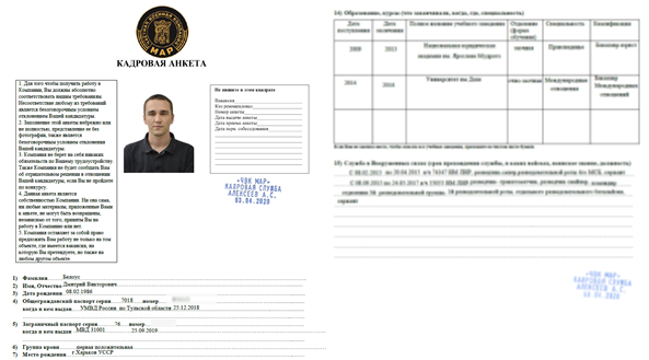 Из контекста заявок и записей собеседований, проанализированных Bellingcat, можно заключить, что «Алексеев» был якобы «директором по персоналу» фиктивной ЧВК «МАР».