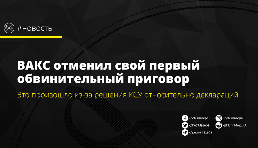 Из-за скандального решения Конституционного суда от 27 октября, касающегося электронного декларирования, Высший антикоррупционный суд отменил первый в своей истории обвинительный приговор. Об этом «Центр протидії корупції» сообщает в Telegram.