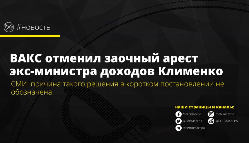 В августе прошлого года Печерский районный суд города Киева заочно заключил под стражу Клименко. Однако позже Генеральная прокуратура Украины передала дело в НАБУ. Адвокаты Клименко подали апелляционную жалобу на заочный арест в Киевский апелляционный суд. Тот передал рассмотрение жалобы в апелляционную палату ВАКС, сообщает «Слово и дело».