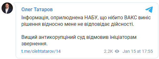 Сам Олег Татаров назвал информацию, опубликованную НАБУ относительно его персоны, недостоверной.