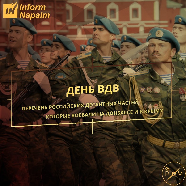 2 августа — День ВДВ. С 2014 года против Украины воюют сотни солдат и офицеров России из воинских частей воздушно-десантных войск, прикомандированных в состав террористических формирований «ДНР» и «ЛНР». Международное разведывательное сообщество InformNapalm в ходе OSINT-расследований за период с 2014 по 2017 год установило: