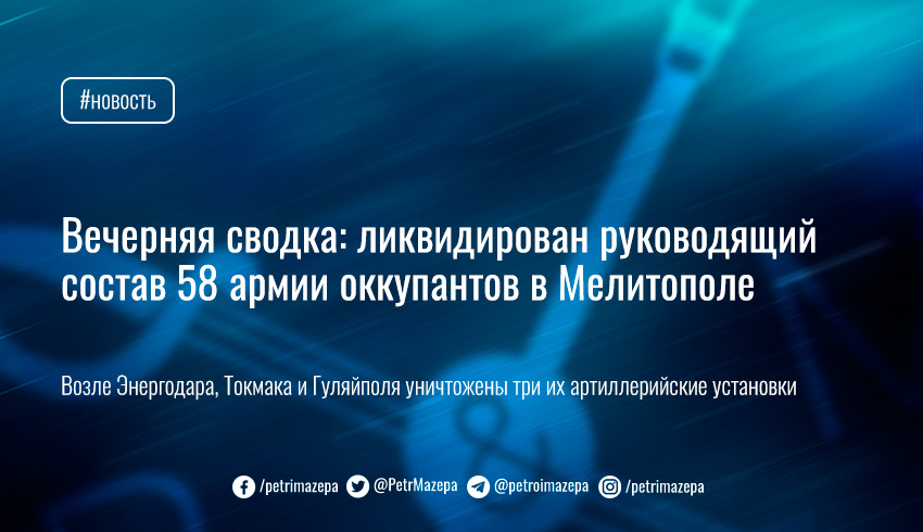 В Мелитополе наши воины ликвидировали руководящий состав 58 армии оккупантов, а возле Энергодара, Токмака и Гуляйполя уничтожили три их артиллерийские установки, до десяти единиц военной техники разного типа и ранили около 150 оккупантов.
