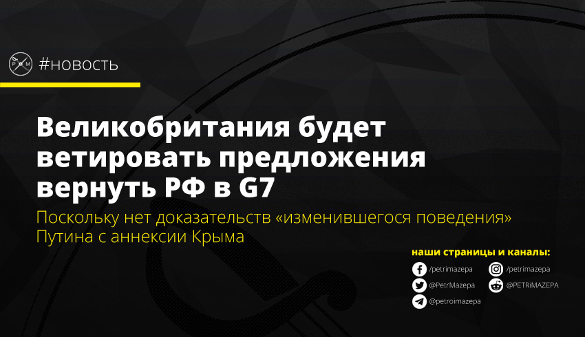 Правительство Великобритании не будет поддерживать возвращение РФ в «большую семерку», если этот вопрос будет поднят на обсуждении. Причина - Москва не изменила свое поведение после незаконной аннексии Крыма в 2014 году.