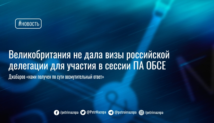 Он добавил, что делегаты своевременно пригласили руководство ассамблеи, а также МИД россии разработать и решить вопрос о предоставлении британской стороной гарантий выдачи парламентариям въездных виз в Британию. «Нами получен по сути возмутительный ответ о том, что правительство Британии — дословно — не может выдать визы членам российской делегации в ПА ОБСЕ, с какой бы целью они ни посещали страну», — сказал Джабаров.