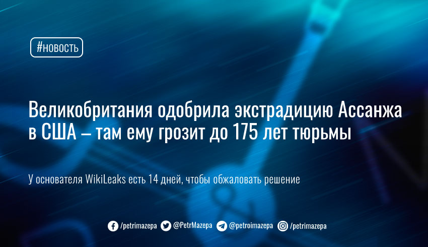 Великобритания одобрила экстрадицию Ассанжа в США – там ему грозит до 175 лет тюрьмы