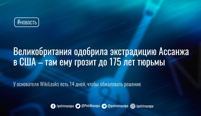 Министр внутренних дел Великобритании Прити Патель одобрила экстрадицию в США основателя WikiLeaks Джулиана Ассанжа.