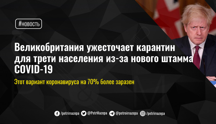 Премьер-министр Великобритании Борис Джонсон объявил о введении локдауна на юго-востоке Великобритании, включая Лондон. На территории, где вводится 4-й уровень карантина, проживает более 16 млн (что составляет около трети населения Великобритании). Ограничения вводятся из-за того, что новый штамм коронавируса на 70% более заразен, чем обычный.
