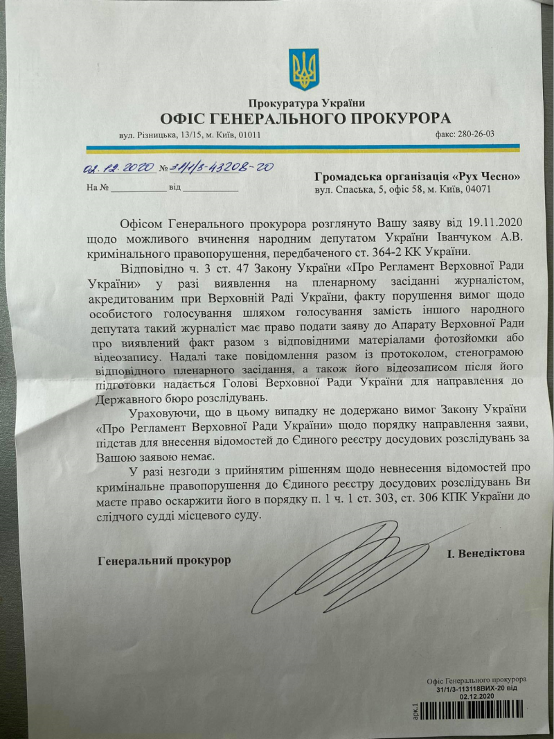 В своем ответе ЧЕСНО Венедиктова написала, что оснований для открытия уголовного производства по заявлению Движения ЧЕСТНО нет, поскольку якобы не были соблюдены требования Регламента ВРУ «относительно порядка направления заявления». Но приводит цитату из пункта о том, каков порядок действий, если о нарушении нардепа заявил другой нардеп. Действия же журналистов в регламенте для подобных случаев не прописаны.
