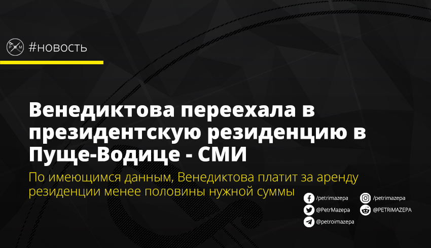 Позднее о новом месте жительства генпрокурора написал в Facebook журналист Юрий Бутусов. По его данным, Венедиктова поселилась в Пуще-Водице в августе и  платит за аренду резиденции (площадью в 675 кв. м) 64 тысячи гривен в месяц.