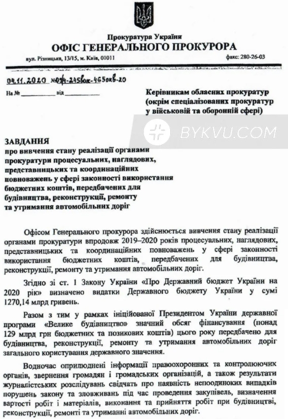 Из Офиса генпрокурора начальникам областных прокуратур было направлено задание о начале проверки соблюдения законности при строительстве дорог в рамках программы «Большое строительство» президента Владимира Зеленского. В качестве аргументации таких действий указывались неоднократные случаи обращения граждан и журналистские расследования.