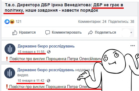 Также в названии видео говорится, что «ГБР не играет в политику». А если промотать ленту публикаций в официальной группе Бюро на Facebook, то можно увидеть – два предыдущих поста посвящены повесткам к Порошенко. И сразу начинаешь неистово верить в честность руководителей Бюро.
