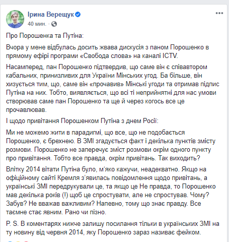 - Вчера в телеэфире ICTV нардеп от «Слуги народа» Ирина Верещук заявила, что пятый президент Украины Петр Порошенко 12 июня 2014 года поздравил главу страны-агрессора Путина с Днем России. Порошенко обвинил Верещук во лжи и потребовал, чтобы она забрала свои слова назад.