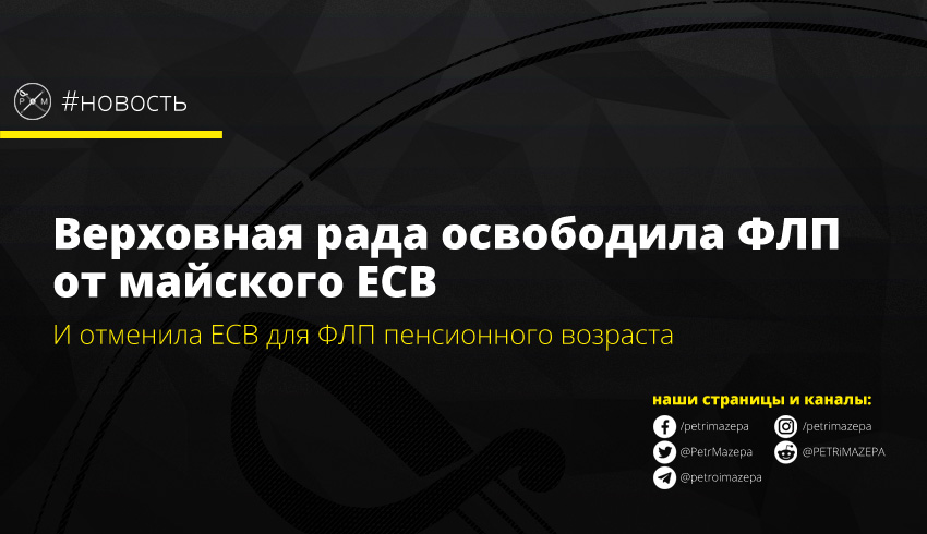 Ранее для частичной компенсации потерь введения карантинных мер для физических лиц-предпринимателей (ФЛП или ФОН) были освобождены от уплаты единого социального взноса (ЕСВ) в марте-апреле. Сегодня ВР 333 голосами приняла во втором чтении законопроект № 3329-д, который освобождает ФЛП и лиц, осуществляющих независимую профессиональную деятельность, от ЕСВ также в мае.