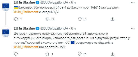 Перед голосованием, представительство ЕС в Украине опубликовало призыв к тому, что необходимо принять поправки к законопроекту №5459-1.