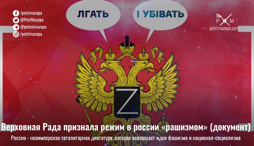 Верховная Рада Украины приняла постановление, которым признала режим в России рашизмом — теперь страна-агрессор признается тоталитарной неоимперской диктатурой с современной версией фашизма на официальном уровне.