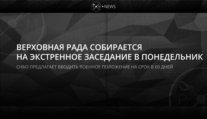 Во время заседания Совета национальной безопасности и обороны принял решение передать в Верховную раду предложение ввести военное положение на 60 дней. Заседание будет созвано в понедельник, в 16:00.