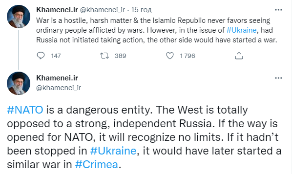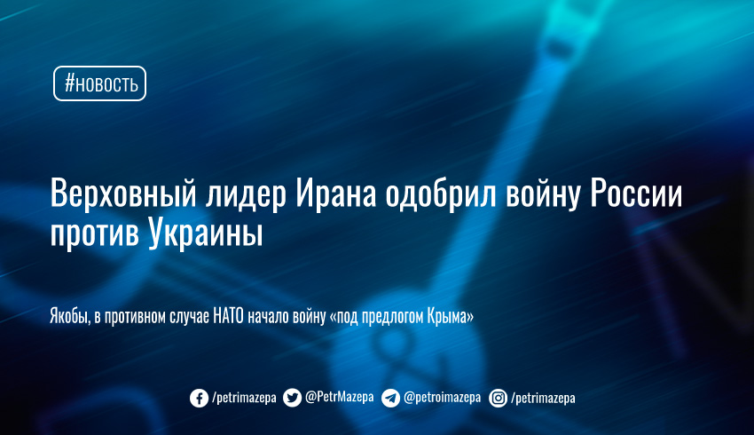 Верховный лидер Ирана Али Хаменеи поддержал развязанную Россией войну против Украины. Якобы, если войска Путина не ударили бы сейчас, то потом бы НАТО начало войну «под предлогом Крыма».