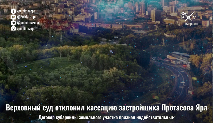 Кассационный хозяйственный суд Верховного суда оставил кассационную жалобу ООО «Бора» без удовлетворения, а решение первой и апелляционной инстанций – без изменений. Таким образом, договор субаренды между ООО «Бора» и ООО «Дайтона групп» земельного участка на территории Протасового Яра признан недействительным.