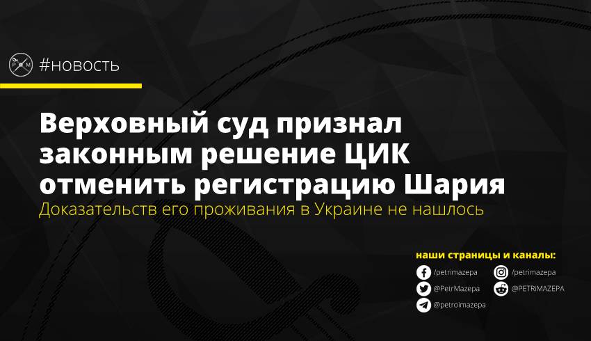 При этом в ВС напомнили, что суд первой инстанции, принимая решение об отказе в удовлетворении иска, исходил из того, что основанием для решения вопроса об отмене регистрации Шария есть письмо СБУ, в котором была указана дополнительная информация относительно последнего места его жительства, а именно то, что Шарий 24 января 2012 года выехал за пределы Украины и после этого на территорию страны не въезжал.