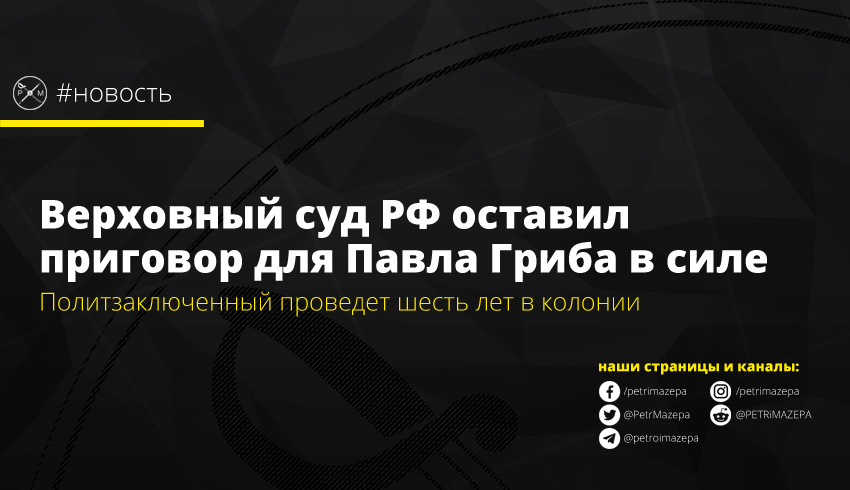 Верховный суд страны-агрессора признал «законным» приговор Северо-Кавказского окружного военного суда для украинского политзаключенного Павла Гриба, согласно которому он должен провести шесть лет в колонии. Его признали виновным в подстрекательстве знакомой к совершению теракта в Сочи.