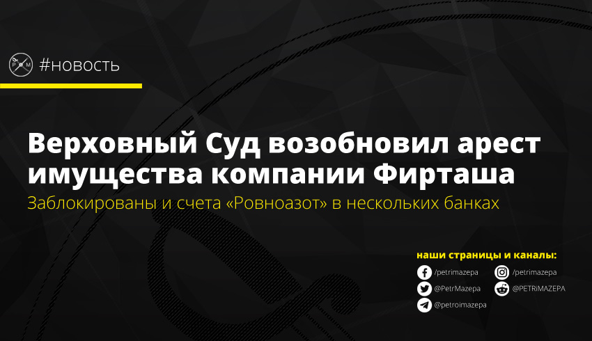 Верховный Суд Украины принял решение, согласно которому возобновляется арест всего движимого и недвижимого имущества предприятия «Рівнеазот». Кроме имущества, суд также возобновил арест счетов завода в банках «Клиринговый дом» и «Альянс».