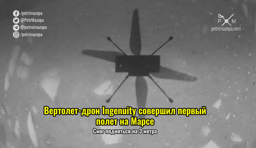 Вертолет-дрон Ingenuity («Изобретательность») совершил первый управляемый полет на другой планете. Он прибыл на Красную планету вместе с марсоходом Perseverance («Настойчивость»), который и вел прямую трансляцию этого событий.