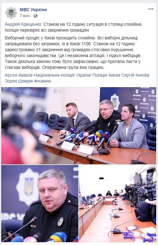 Глава полиции Киева Андрей Крищенко, по состоянию на 12:00 дня ситуация в Киеве спокойная, все избирательные участки заработали без задержек. Зарегистрировано 31 обращение от граждан о нарушениях.