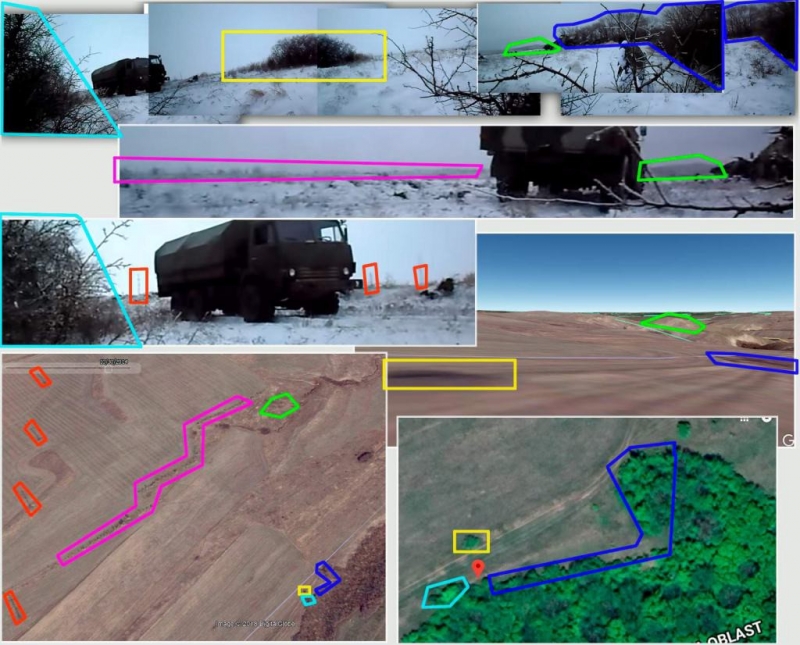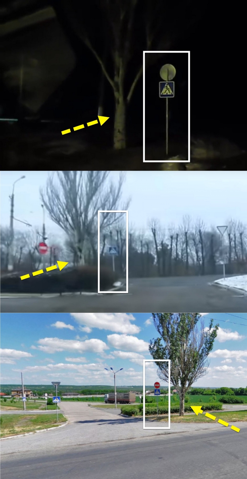 На первой ночной записи видно, как по улице идёт тяжёлая техника, причём наёмники «Вагнера» утверждают, что это «наши». Хотя на первый взгляд ночное видео представляется негеолоцируемым, твиттер-Шерлоки всё же нашли место съёмки: на западе Луганска. Геолокацию удалось провести благодаря сравнению знака пешеходного перехода и дерева, едва видимых на «Яндекс.Панорамах» и на видео с регистратора.