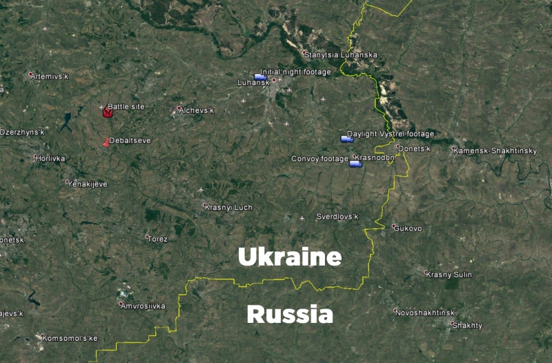 Итак, мы видим, что различные кадры видео сняты в районе Луганска, Краснодона и к северу от Дебальцево.